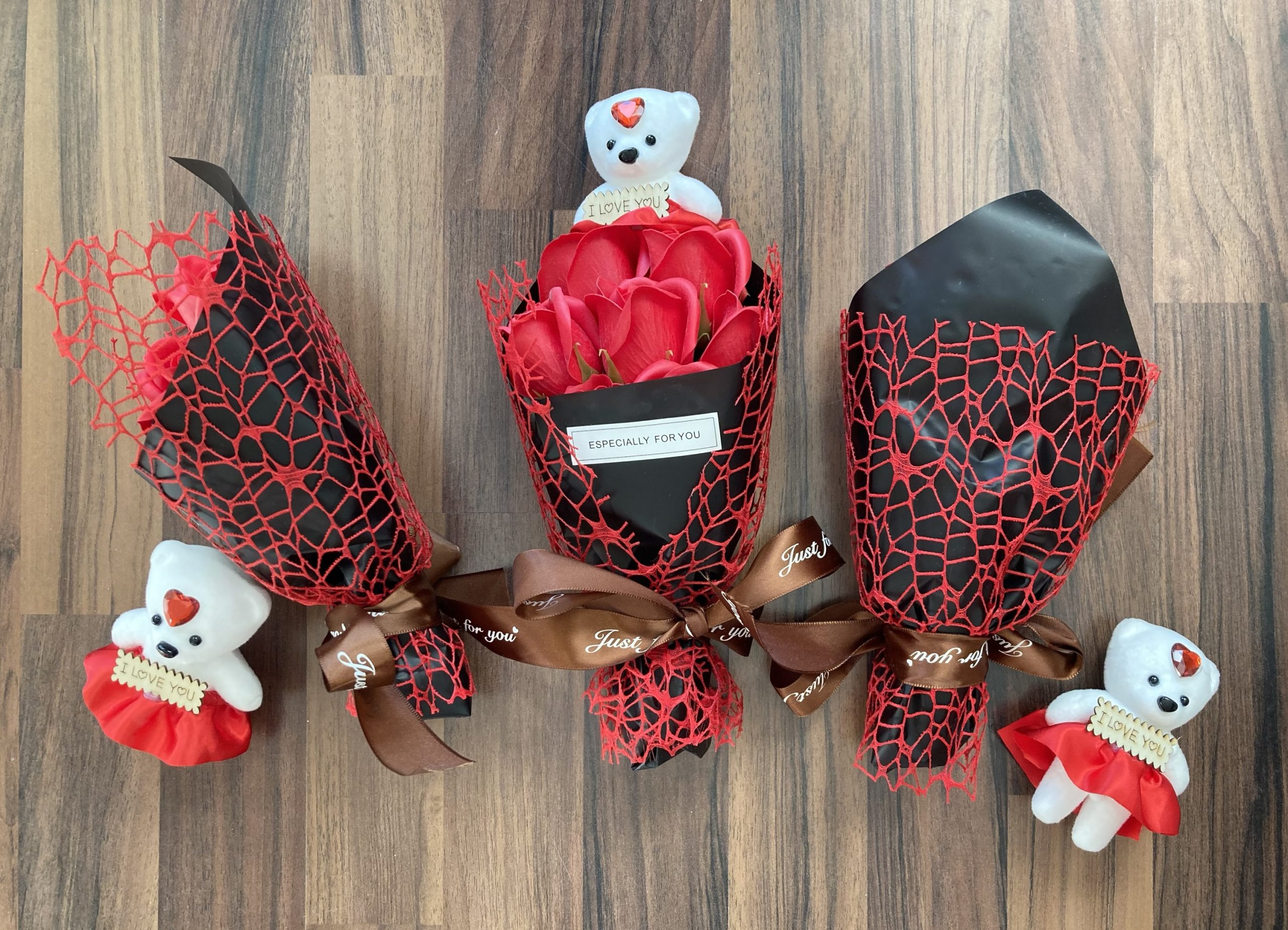 1 x künstlicher Blumenstrauß mit 7 ewigen roten Rosen und kleinem Bärchen der extra ist und sich variabel einsetzen lässt,
